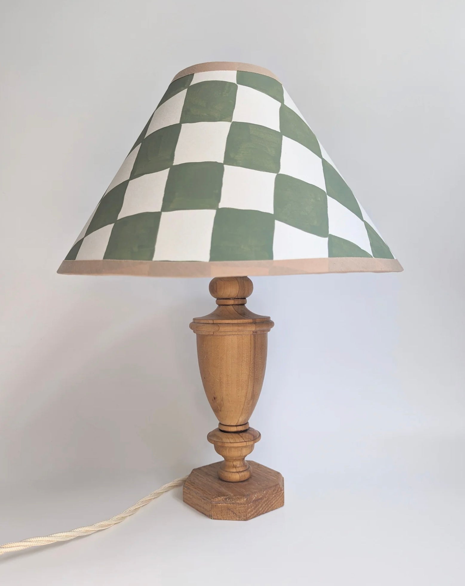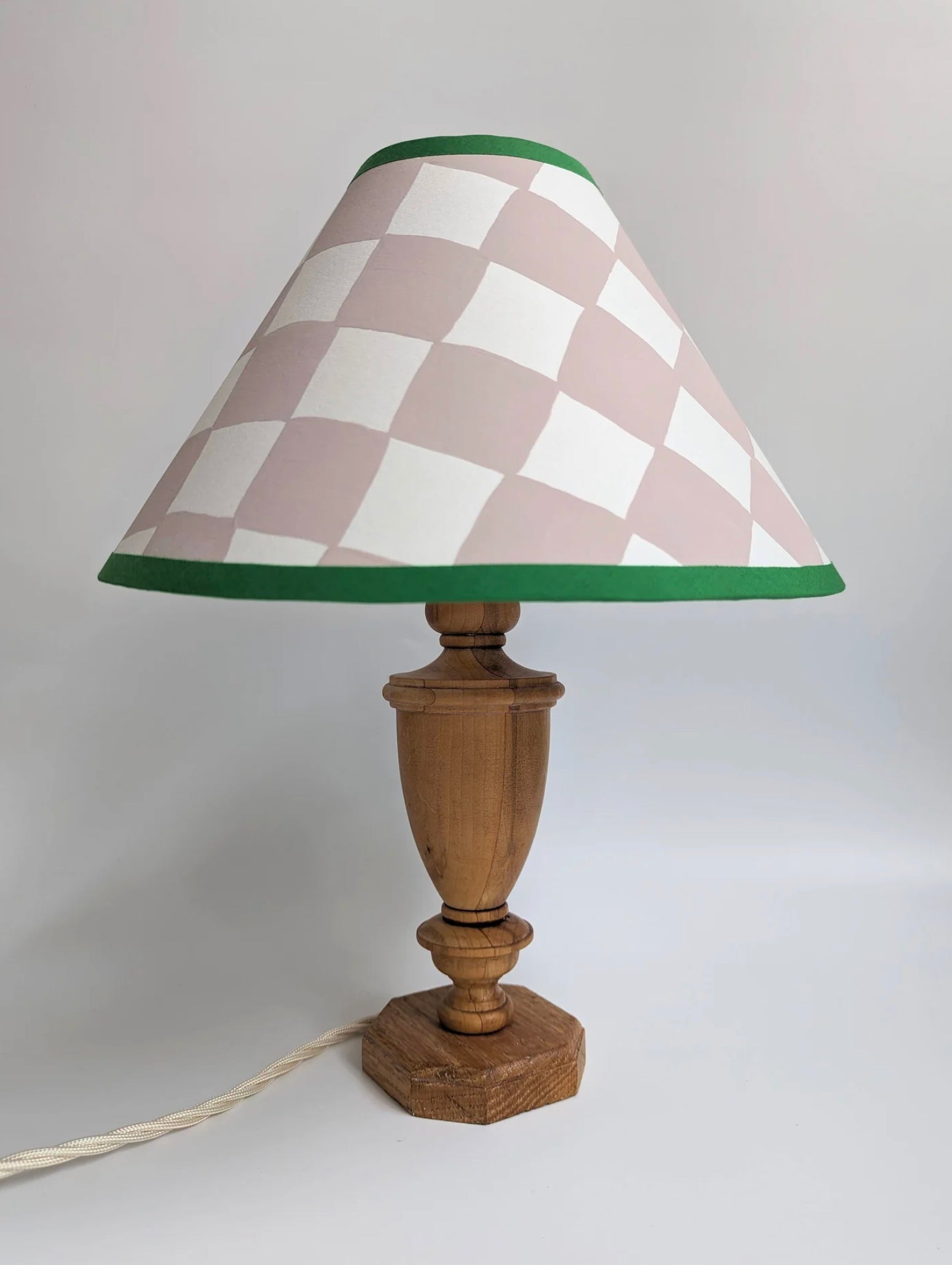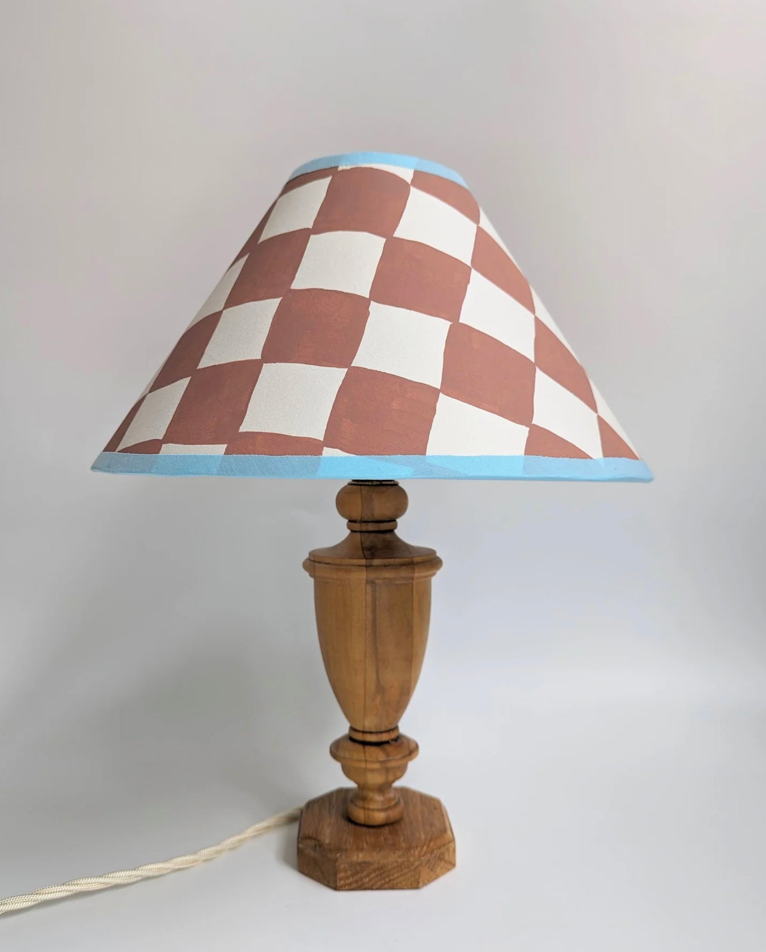Customising our signature coolie lampshade, by tweaking the dimensions to acquire a steeper slope. We use Rosie's hand-painted paper, and add a contrasting cotton bias trim. The results are gorgeous, the perfect accompaniment to Rosie's handmade ceramics.