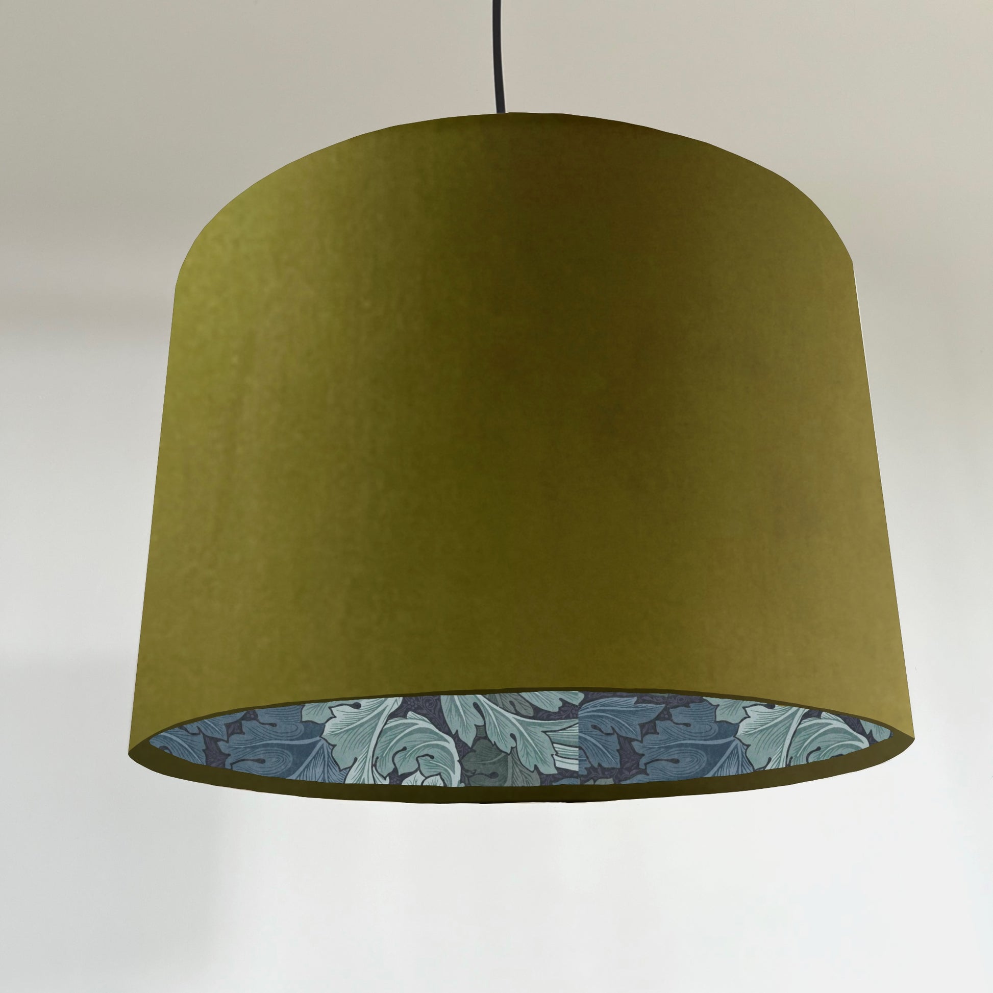 Luxury olive green velvet lampshade paired with a blue leaves paper interior