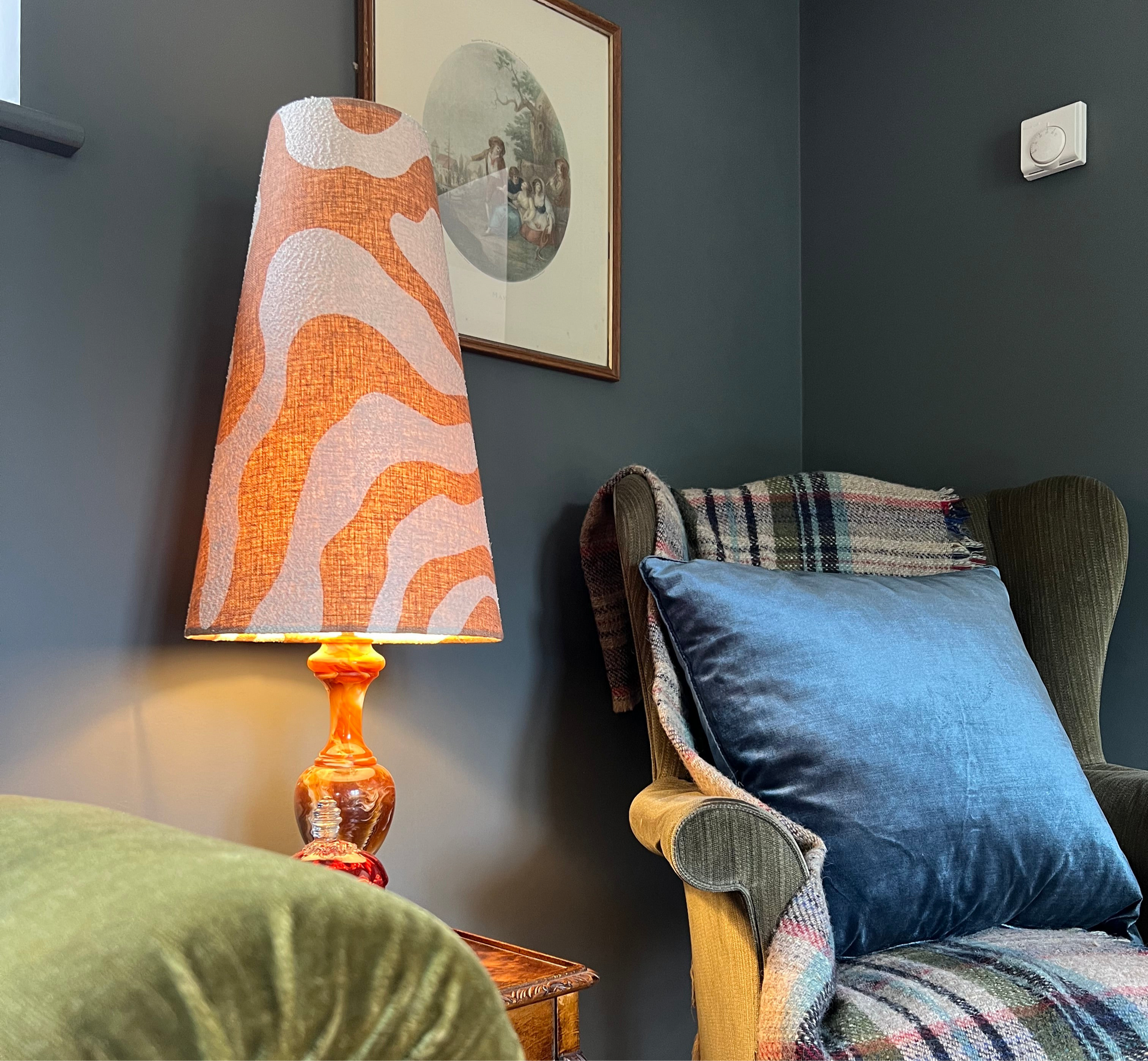 Extra tall lampshade in luxury Orange Sandstone wiggle fabric paired with a white lining, our wiggle fabric is a blend of polyester, cotton and linen, ideal for soft furnishings like lampshades, cushions and curtains